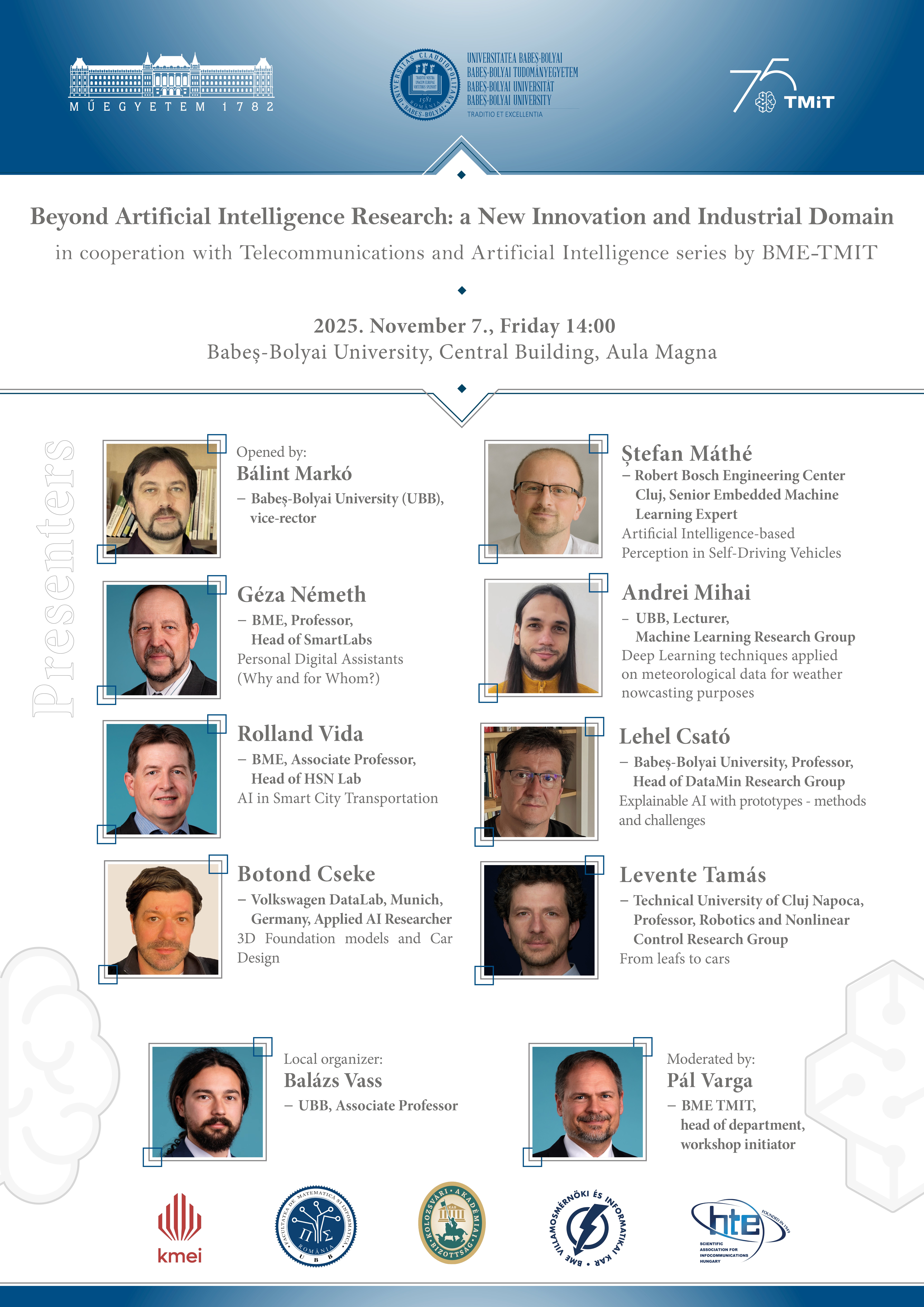 “Beyond Artificial Intelligence Research: a New Innovation and Industrial Domain”, organized jointly by the Faculty of Mathematics and Computer Science of Babeș-Bolyai University (UBB) and the Department of Telecommunications and Artificial Intelligence (TMIT) of the Budapest University of Technology and Economics (BME).